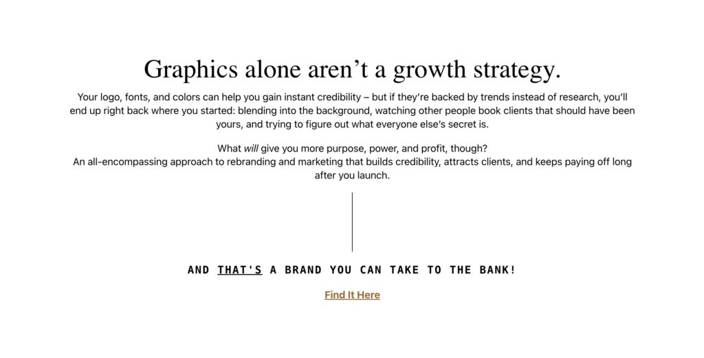 In researching for Rebecca’s project, I found that not all brand designers offer strategy as part of their packages, and even when they do – the definition of “strategy” (and what kind of deliverables you actually receive to communicate that strategy) varies widely. We needed to be SO clear that Rebecca provides a significant amount of strategy, and that that was an uncommon and advantageous selling point for her!