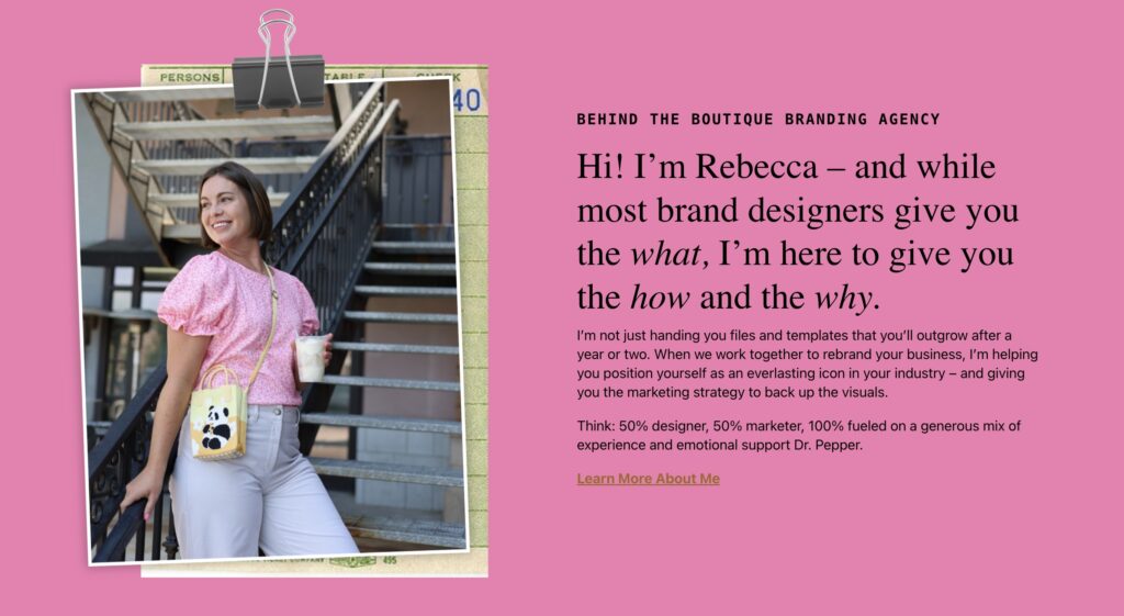 Not all brand designers are comfortable owning the role of brand design in marketing, but Rebecca IS – so we leaned into that with her messaging.